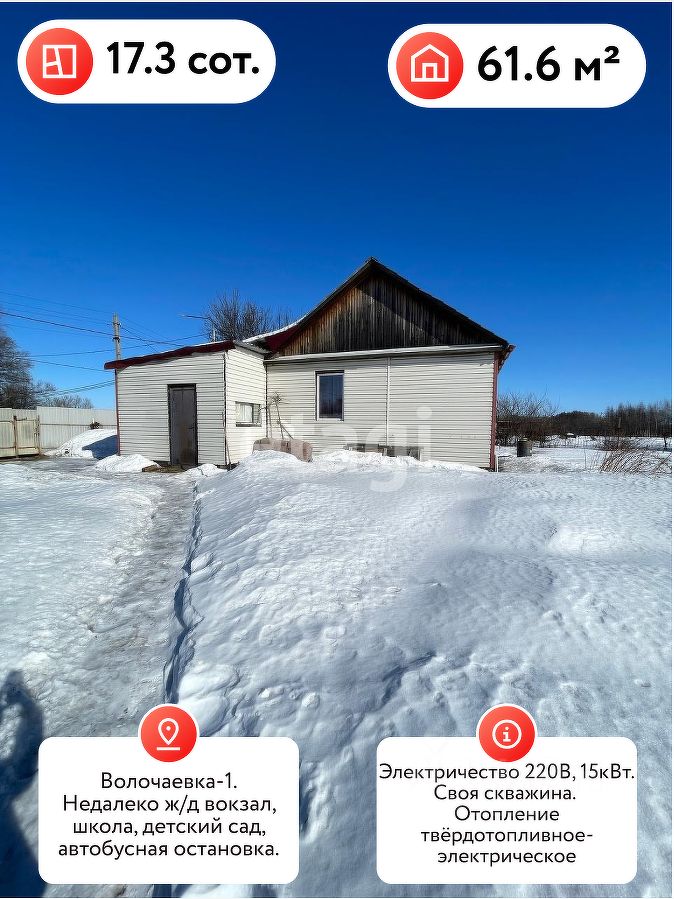 В продаже уютный-тёплый дом 2014 года постройки 4-х комнатный+ кухня в селе Волочаевка-1 Смидовичского района, ЕАО. 40 км до города Хабаровска. Дом обшит сайдингом с утеплением (изовер), площадь 62 кв. м. фундамент ленточный, кровля металлочерепица, электричество 220 В 15 кВт. В доме сделан ремонт, пластиковые окна, межкомнатные двери, на полу линолеум, кондиционер, душ кабина, бойлер, своя скважина, отопление твёрдотопливное- электрическое. Мебель, которая останется при продаже, обсуждается с покупателем. Участок ИЖС-ЛПХ огорожен проф листом 17,3 соток, чистый, ухоженный на участке: баня, сарай, плодово- ягодные насаждения: клубника, смородина, вишня, малина, груша, абрикос, слива, виноград, орешник. Подъезд к дому -асфальт. Недалеко ж/д вокзал, школа, детский сад, автобусная остановка (ходят маршрутки). Подходит под ипотеку и ДВ тоже. Даём гарантию безопасности сделки. ЗВОНИТЕ записывайтесь на просмотр покажем - расскажем и приобретайте!