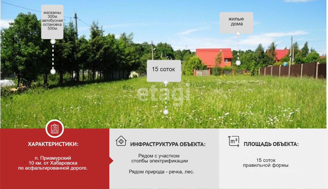 Продается отличный земельный участок (ИЖС) 15 соток в экологически чистом районе на левом берегу Амура вблизи Хабаровска всего 10 км. по хорошей асфальтированной федеральной дороге и немного грунтовой - уникальная возможность для тех кто хочет построить дом своей мечты. На участке установлены винтовые сваи под фундамент дома. Провести электричество на участок без проблем, рядом расположены столбы электросетей. Загородная жизнь вдали от городской суеты и близость природы позволит вам насладиться чистым воздухом, отдохнуть душой - рыбалка, сбор дикоросов, грибов и ягод. В летнее время рядом речка, пляжный отдых. Земля в собственности. Отличное предложение. Звони, прямо сейчас.