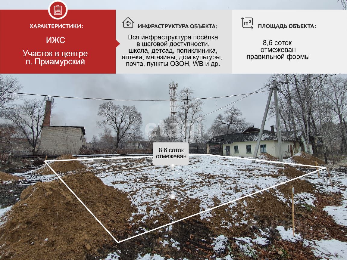 Продается уникальный земельный участок в центре посёлка Приамурский, всего в 10 км от Хабаровска! Площадь участка составляет 8,6 соток, он имеет правильную форму и уже отмежеван, что значительно упрощает процесс строительства. Это идеальное место для вашего будущего дома, магазина или торгового центра! Участок предназначен для индивидуального жилищного строительства (ИЖС, коммерческого использования) и уже подготовлен к строительству: он отсыпан и готов к вашим идеям. Все центральные коммуникации — водоснабжение, отопление и канализация — находятся в непосредственной близости, что делает его ещё более привлекательным для комфортной жизни или бизнеса. Расположение участка центр поселка - в шаговой доступности находятся все необходимые объекты инфраструктуры — школа, детский сад, магазины, почта, поликлиника, аптеки, а также дом детского творчества и дом культуры. Регулярное транспортное сообщение, включая автобус и электричку, позволит вам легко добираться до Хабаровска и других окрестных районов. Не упустите возможность стать владельцем этого замечательного участка в центре поселка — такие предложения появляются крайне редко! Звоните прямо сейчас.