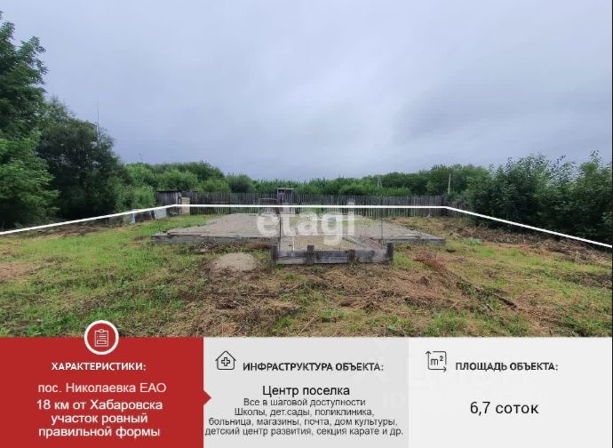Участок 6,7 соток в собственности. Отличные подъездные пути, от Хабаровска до участка - асфальт. Назначение земли для индивидуального жилищного строительства. На участке залит бетонно-ленточный фундамент, размер 10м.х9,5м. Площадь 1 этажа дома 95 кв.м., если построить 2 этажа 190 кв.м. Глубокий погреб 2,5 м. стены укреплены кирпичом. Частично огорожен профлист + деревянное ограждение. Электричество по границе участка. Неподтопляемое место. Инфраструктура поселка в шаговой доступности школа, дет.сад. магазины, почта, МФЦ, Сбербанк, поликлиника и др. Документы к сделке готовы, один взрослый собственник. Земельный участок подходит для ипотеки под строительство дома. Помощь в одобрении ипотеки.